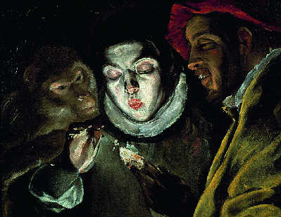 矫饰主义代表人物艾尔·格列柯的作品是本次展览诸多看点之一。《耶稣怀抱十字架》、《青年绅士画像》以及《施洗约翰和福音传道者约翰》都有着“希腊人”格利柯其标志性如火焰般颀长的人形,这也成了毕加索蓝色时期的人物刻画的范本。《寓言》是唯一看不到人物躯体的一幅作品。画面中央展示的一少年正对着一块未烧透的木炭吹气,以使木炭烧得旺起来能点燃他的蜡烛。在他的身后,有只猴子,像是个好奇的女性一般探出脑袋来看究竟。画面蕴含着某种流浪汉作品的氛围,让人不禁想起一句西班牙谚语:男人是火,女人则是木屑。这幅画作是此次展览保险费用最高的一幅。