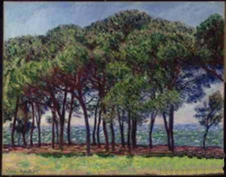 莫奈以极富动感的笔触,生动地勾画出松树和海岸线的美态。他以朴实自然的色调,配以紧密的构图,为松林添上不一样的层次感。画中湛蓝的海水背景叫人赏心悦目,令观者自然地进入画中那恬静舒心的优美环境中。