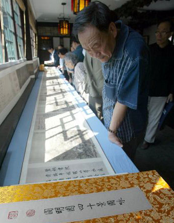 9月19日,民建北京市东城区委在北京茶尚云轩茶馆举办《雅赏经典喜迎奥运》暨晋唐宋元明清书法、绘画手卷复制真赏展,吸引了社会各界书画、收藏爱好者前往参观。中新社发杨可佳摄