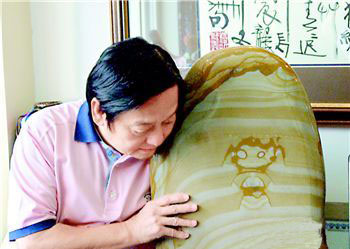 近日,一枚酷似“福娃”的奇石引起了“福娃”设计者韩美林先生的极大兴趣。这枚奇石刚刚入选2007中国十大国石,石头的正中央就是深受人们喜爱的、活灵活现的奥运“福娃”。她头顶上长着两条俏皮的小辫,十分活泼可爱;两只卡通的大眼睛,非常灵动传神。双手持一条彩带随风飘舞,仿佛将北京2008奥运会的福音撒向人间。整幅画面自然天成,形象逼真,令人由衷叹服大自然的神奇造化。韩美林看到这枚天造“福娃”,连连夸赞说:“这块石头挺神奇的,没有人工雕琢,真是不错。国家体操队的一个朋友曾送给我一块石头,也像福娃,很小,没这个大,也没这个像。我见过全国各地不少石头,就属这块最像福娃。”韩美林非常激动地拥抱“福娃”,竖起了大拇指。快门响起,记下了这位中国传奇艺术大师和奇石福娃的奥运情缘。