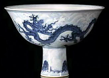 说它不起眼,主要是相比瓶、樽这样的大型器物,高足碗实在是微不足道,但之所以能够成为专场中的焦点,就是因为其是明初宣德皇帝彰显皇权的力作。此碗巧妙地分以淡雅的浅蓝釉绘画水波纹,双龙和奇石则以浓艳鲜明的深蓝精描。双龙瞠眼张口,怒发冲天,锐爪狂张,取态威武矫健。此纹饰的高足碗产量极少,能完整存世者,更是万中无一。