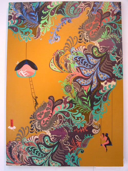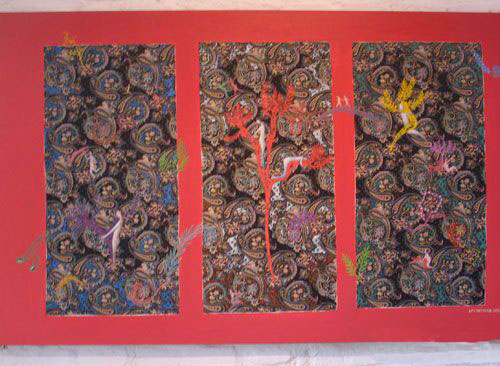 林伟祥的作品,体现出他对现代工业文明和现实生活的精神状态的认知能力,他在作品中借用日常生活中所司空见惯的花布作为创作的基调,并以聪智的调侃的不经意的图形潜入床单和花格中的应有位置,这种手法带有一定的极少主义和拿来主义的色彩成份,作品包涵了情窦初开的暗示和生存状态中模糊的骚动不安的揭示,从而使作品有一种社会性中的可复制性的批判。