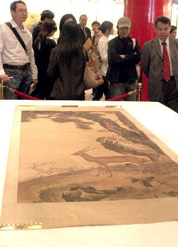 5月5日,一幅初步鉴定为清代宫廷画家郎世宁(意大利人)画作《松树羚羊图》,在台北圆山饭店现踪。据指,该画在八国联军侵华时即下落不明,至今已一百零七年。数十年前,有台湾商人从海外购回,近日收藏家有意出售。郎世宁擅长画肖像、人物、花鸟、犬马、山水等,《松树羚羊图》却是以郎世宁画作中少见的羚羊为主角,技法栩栩如生。 中新社发 黄少华 摄