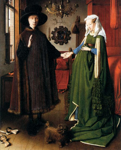 《阿尔诺里夫妇》,同样于15世纪诞生,作者是杨-万-埃克(1390-1441)。此时的人物形象已经渐渐清晰,但比起真人还是显得瘦削白皙了一些。现这幅油画被收藏在伦敦的国家博物馆内。