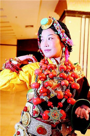 当秋一行是10月19日从德格出发的,由于赶上下雪,500多公里的山路他们行进了2天才到达康定。记者见到当秋时,她正在试穿那套价值千万元的藏服。当秋告诉记者,她身上穿戴的全套藏族服饰重量超过了50斤。“我这套服装算得上是藏族最隆重的服装了,光腰带就有3条,还镶嵌着珊瑚等宝石。”当秋一边在别人的帮助下系上腰带一边告诉记者,她的腰带、项链都要戴三四层:“越多越好呢,它显示着财富,也蕴藏着吉祥的祝福。”从套上藏袍到挂上佩饰、耳坠、盘头……穿戴好这套藏族服饰,当秋花了将近半小时。