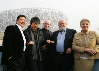 昨天下午,“鸟巢”建设工地来了一群特殊的客人。他们是参加本届北京国际音乐节的世界著名音乐家潘德列茨基、艾森巴赫以及青年钢琴家郎朗、指挥家余隆。他们首先来到北京市2008工程中心展厅,参观了“鸟巢”、“水立方”等模型,听讲解员详细介绍了建设规划。随后,他们又兴致勃勃来到雄伟的“鸟巢”建设工地。