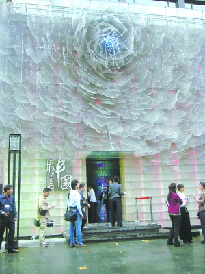 让观众叹为观止的是“琉璃中国”博物馆外墙上由不锈钢丝网制作而成的巨型牡丹花装置。这朵具有现代气息的钢丝牡丹花花了3天时间才安装完毕,几乎覆盖了整座博物馆墙面。它长38米、宽7.8米,总重接近2.5吨的不锈钢构件直接暴露在空气中,散发出沉重而且坚固的金属质感;与之相反,无数个结构联成的大小参差的镂空处又增添了大量虚无飘浮的色彩,两种极致的视觉形象交错成一幅立体的街景。杨惠珊小姐将这件户外公共空间的装置艺术命名为“是牡丹,终究开放”,其中投射的含义令围观者众说纷纭。有人断言:“它就是杨惠姗内心的投影”,是艺术家这20年创作历程的心灵写照。