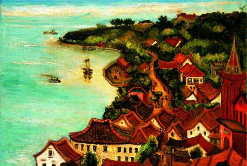 据中评社报道,1936年是台湾的日治时期结束,重新回归中国重要的一年,被誉为台湾最有才华的艺术家“中国梵谷”陈澄波也从上海回到了台湾,看着淡水西照微黄的夕阳、一排排荷兰式的红瓦屋舍、蜿蜒的黄土街道、三两成群的渔民,一时感慨,在这里画下了台湾艺术史上最重要的作品《淡水夕照》。