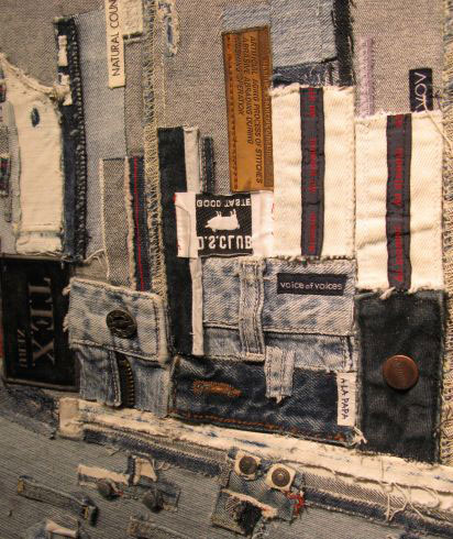 近看韩国画家崔素荣《盘如洞的家》,全画都是画家以二手牛仔裤的布一块块贴上组成的,别具匠心。