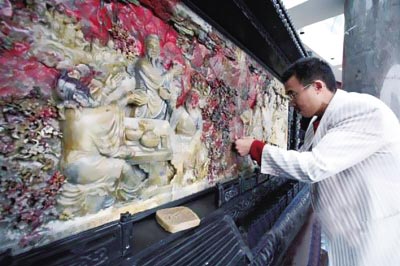 鸡血石屏风桃园结义现身杭州 价值达3000万