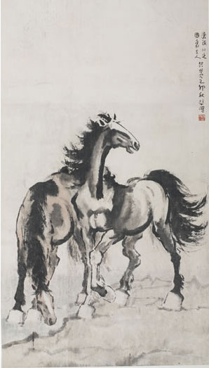 (徐悲鸿 双骏图 125×71 设色纸本镜心)