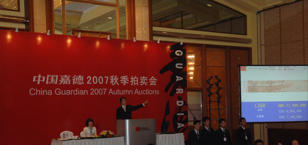 11月13日,中国嘉德2007秋季拍卖会圆满结束,包括中国书画、瓷器工艺品、油画雕塑、当代艺术、影像艺术、古籍善本、邮品钱币铜镜等在内的共19个专场,精品迭出,佳绩连连,总成交额超过6.98亿元人民币。