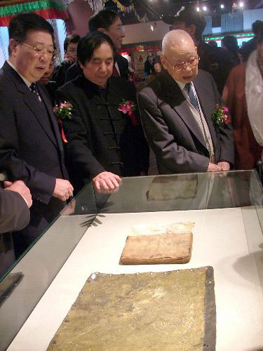 “叶星生抢救、保护西藏民间文化遗产成果展”二十二日在北京开幕,图为叶星生(中)向西藏自治区原党委第一书记阴法唐(右)讲解最新收藏的一本《藏文羊皮书》和非常罕见的金属板唐卡。徐长安 摄