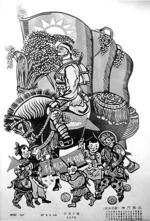 赖少其作品《抗战门神》套色木刻。一位中国军人骑着高大骏马准备出征,村口送别的群众扛着一幅“庆祝抗战胜利”的标语。作品以民间习俗中的门神形式,承载抗战救亡的内容,在1939年春节被大量印刷,被贴在桂林以及抗战大后方的千家万户中,营造了“匹夫有责”的抗战气氛。(翻拍照)