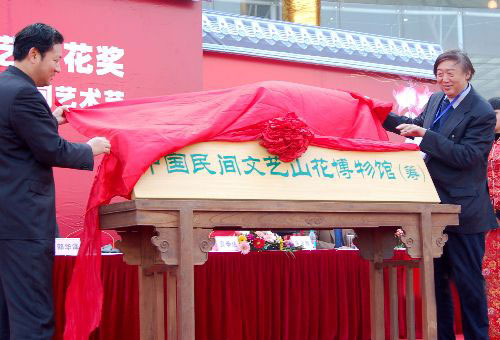 中国文联副主席、中国民间文艺家协会主席冯骥才(右)与苏州相城区区长曹后灵共同为中国民间文艺山花博物馆(筹)揭牌。 邱勇 摄