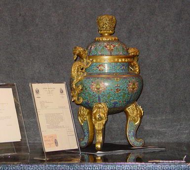 这件尖顶三角香炉曾经陈列于清朝皇室园林“圆明园”,香炉高55厘米,外表绘有花朵图案,镀金铜顶有一些损坏,但是,并不妨碍它成为也是当晚最昂贵的拍卖品。据悉,该件乾隆珐琅熏炉的托卖人是收藏家R.C.Bruce,据称他是由曾任英国驻北京外交官的曾祖父处获得此物,其曾祖父在1860年,以125英镑的价格购得此熏炉。不过拍卖行拒绝透露更多卖家信息。拍卖前有消息称,有华裔打算参与竞投,希望能物归原处,将该项文物捐赠给祖国。