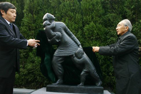 2007年12月4日,著名雕塑家滑田友生前创作的《轰炸》雕塑捐赠仪式在侵华日军南京大屠杀遇难同胞纪念馆举行。《轰炸》是滑田友先生1937年—1946年在法国创作完成,描写了一位母亲手抱幼儿,拉着几岁大的儿子躲避飞机轰炸的情节,通过三个不同年龄人物的不同动势与表情,表现出他们在敌机轰炸下的心理状态,揭露了日本帝国主义对中国人民的残害,同时以艺术的手法表现出一种极端状态下的人性光辉。阿董摄