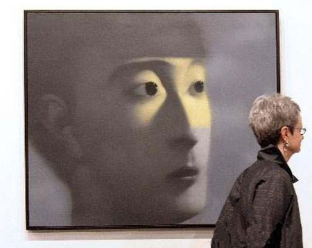 (迈阿密现场一位女性走过张晓刚《同志》的前面)