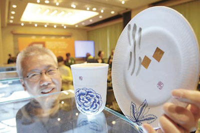 设计师靳埭强(图)热爱明朝青花瓷,他与哥本哈根皇家瓷器合作,设计出10人用的中式餐具《华宴》,把明朝青花瓷的特色融入当中。(图片来源:香港明报)