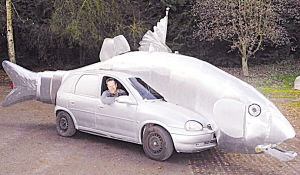 英国波厄斯郡奈顿市48岁艺术家安迪·哈泽尔竟然对自己的一辆沃克斯豪尔汽车进行“改头换面”,将它改造成了一条海鲈的形状。不过,当哈泽尔驾驶这辆“大鱼汽车”逛大街时,虽然吸引了众多的回头者,但他却发现自己很难找到停车的地方,因为普通的停车位对这辆从“鱼头”到“鱼尾”长达5.5米的汽车来说,实在是太小了。