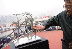 另外,北京奥组委推出的首款全部采用鸟巢剩余钢材制成的奥运特许商品“鸟巢第一榀钢雕”亮相。钢雕按1:100的比例制成,采用鸟巢钢结构第一榀(鸟巢桁架中最矮的一个,首先支起鸟巢)形状,每尊售价2.98万元,发行5000尊。