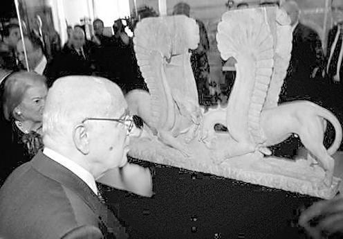 图为意大利总统纳波利塔诺出席展览开幕式时在一尊展品前驻足观看。