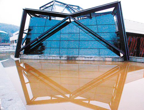 它如同刚刚从程泰宁院士的构思草图里扑腾出来一般——它很矮,矮到远远望去,几乎完全融于西湖边的景致;它很现代,玻璃顶错落有致,身姿层层跌落;它又很江南,主调是灰色的,如同一座粉墙黛瓦的江南民居;它使用了许多当今最先进的建筑材料,却与身边的原始绿色共生。在这样一座建筑面前,所有的矛盾元素都像被收编了,呈现的只有和谐。