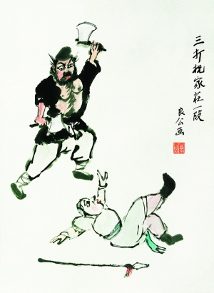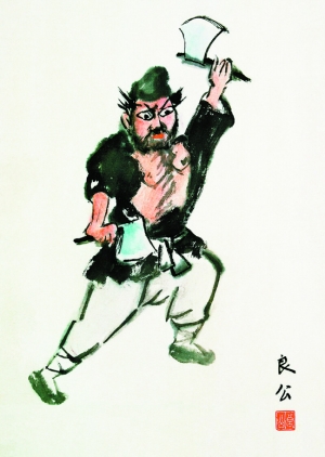擅长画戏剧人物画的海派大画家关良,由于他的艺术具有“笔”简意赅,大智若愚(修养不深的收藏人会误解为它像形态把握不准的儿童画)的突出特点,因此他的作品就常常被造假者盯上并作了“内容删减”伪。图1是我多年前目睹到的关良水浒题材作品真迹,此图共画有正在打斗的二个人物,我对其印象较深的是其笔墨造型的生动与拙趣。可就在接触图一不久,我偶然在某地的画廊中,看到图一的“相对克隆”本图二了。此画的画面大大“瘦身”,它只画一个像在空地上耍刀弄斧的李逵形象。比较两图可知,作伪者其实只克隆原作一半的“画”的内容,款识原母本写着是“三打祝家庄一段关良画”,到疑伪成品上就只剩下少得不能再少的“关良”二字的穷款,但图二这件疑伪成品却分明具有八九成的仿真程度。我不能不叹服当今书画伪作炮制手法的“高明”,“内容删减”已成书画造假“省时增效”之重要一招。