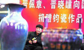 据晋佩章介绍,此次捐赠的“和谐宝鼎”、“太平尊”等6件柴烧钧瓷,还原于宋瓷造型的“深厚端庄,典雅大方,纹饰简练,线条流畅,棱角突出,起伏得当”,都是百里挑一的美器。
