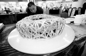 记者7日在上海长宁文化艺术中心看到,一座直径72厘米、底盘长1米的北京奥运“鸟巢”陶瓷作品烧制完成,向市民免费展出,喜迎2008北京奥运。目前,景德镇陶瓷文化传播协会多位艺术家已经开始挑战难度,力争制作出一座直径1米的鸟巢陶瓷作品。