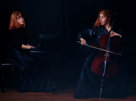 《二重奏》是陈逸飞音乐题材肖像画中尺寸最大的一幅(238厘米×162厘米),作品创作于1988年。作品中陈逸飞用其特有的手法,以深色背景衬托二位音乐家演奏时的动态和神情,静中有动,相得益彰,古典音乐中那既深沉,又浪漫的唯美色彩弥漫其中。作品构思大气高雅,笔触柔和不失精准,几乎达到完美境界,令观者为之倾倒。