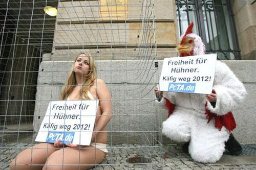 1月16日,德国柏林街头,主张动物权力的行为主义者以特殊的裸体行为艺术抗议笼养母鸡,他们手里举的牌子上写着“给母鸡自由,2012年前消灭所有笼子”。