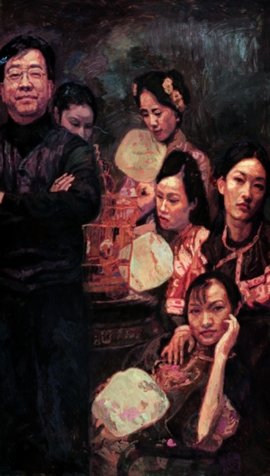 陈逸飞的这件作品作于1999年,尺幅巨大,高达2.9米。画中艺术家在众美女的环绕下双手抱胸笑对观众,十分罕见。“阳光艾德”的总经理赵音女士因此把这张画与其早年的同类作品《踱步》相比,比作是艺术家的自画像,她认为作品有很高的艺术价值与文献价值。两相比较,《踱步》中艺术家背对观众低头沉思,背景是中国近现代史的画卷。可以说无论就作品的尺幅、构图还是造型、立意,确实可以作为陈逸飞相同性质的自画像来看,而两张作品所反映的艺术家对社会生活的关注焦点的变化,也是有迹可循。