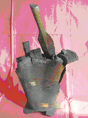 装有陪葬品的铜盖盅(公元前5世纪-公元1世纪)铜盖盅形似提篮,用于盛放陪葬品,下葬于墓葬中。这件铜盖盅保持着出土时的原貌,里面的陪葬品为6件铜矛、1件犁铧和2件铜斧。