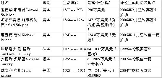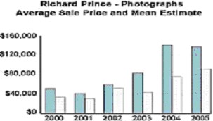 21世纪之前摄影作品的最高单件拍卖纪录为82.24万美元。进入21世纪,无论从市场投放量、成交率还是从单件最高成交价位上分析,这一板块都不断显示着巨大潜力。2005年11月理查德·普林斯的《无题》以124.8万美元成交,创下当时最高拍价纪录。这位前记录创立者自2000年以来的平均销售额和指标性报价见下表: