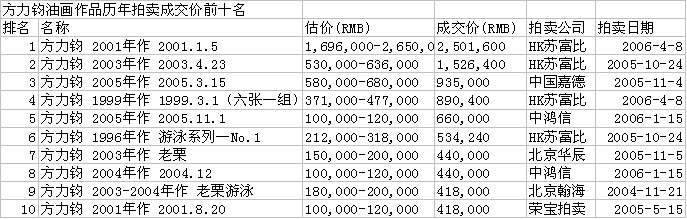 方力钧的作品在拍卖市场中一向很受欢迎,在刚刚结束的纽约苏富比亚洲当代艺术专场和香港苏富比春拍中,其作品的成交价总体上高于2005年,并刷新了其作品成交价的新纪录。纽约苏富比共推出5件方力钧的作品,其中《无题》(1997年作)成交价为226.27万元人民币,《无题》(2001年作)成交价为109.16万元人民币,其他几件小幅作品也以几十万元的价格成交。香港苏富比拍卖公司推出2件方力钧的作品,也以较高价位成交,如《2001.1.5》(2001年作)成交价为236万元人民币,《1999.3.1(六张一组)》(1999年作)也以89.04万元的价格成交,其中的《2001.1.5》创出了方力钧个人作品成交价的最高纪录。