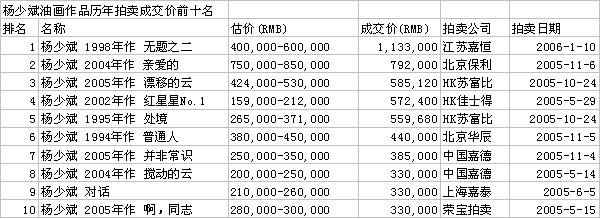 杨少斌也是在此季苏富比推出的两场春拍中作品价格涨幅较大的艺术家。2006年春拍前,杨少斌的作品仅有一件上百万元,即江苏嘉恒推出的《无题之二》(1998年作)以113.3万元成交。而在2006年苏富比推出的两场春季拍卖中,杨少斌越百万元的作品就有三件,即纽约苏富比推出的《受伤的培根》(2005年作)成交价为114.126万元,香港苏富比推出的两件作品《溶化的风景》(2004年作)和《无题》(2000年作)均以101.76万元成交。以上数据可以看出,杨少斌作品的整体价位有了较大涨幅,在海外市场中越来越受到藏家的注意和青睐。