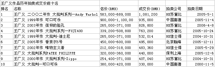 王广义作品市场价格的形成和发展一向仰仗的是海外艺术机构的推动。此次纽约苏富比和香港苏富比两场拍卖中,王广义作品的价格继续升涨。纽约苏富比推出的两幅作品《大批判-波普艺术》(2005年作)成交价为198.48万元,《大批判-安迪·沃霍尔》成交价为124.05万元,成交价均高出了2005年由香港苏富比推出的《大批判-安迪·沃霍尔》(2002年作)创出的最高价108万元,可见王广义作品价格的涨幅之大。香港苏富比推出的《信仰的脸孔》(2003年作)也以82.68万元成交。以王广义的作品为代表的政治波普类作品,正逐渐受到海外收藏界的重视和竞买。