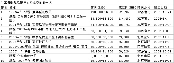 洪磊作为中国当代观念摄影的重要艺术家之一,其摄影图片作品近年来逐渐成为一个新兴的投资点,他的这类观念摄影作品在拍卖市场中一直有良好的反应。在2006年春季苏富比纽约和香港的两场亚洲当代艺术拍卖中,其作品价格仍有一定的涨幅。《南京长江大桥/牡丹亭》(二张一组)以8.4万元港币成交。另外两张《我梦见我在阆苑遨游时被我父亲杀死》和《仿宋山水芙蓉图》在纽约苏富比拍卖中都以9,600美元成交。成交价和成交率都比往年有了一定的涨幅,洪磊摄影图片作品作为一个新兴的投资类别在市场上有较大的市场增值空间。 目前,洪磊正在美国纽约的前波画廊积极准备个展。