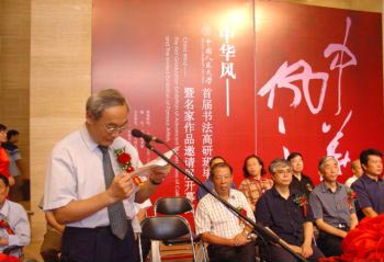 中国美术馆8月20日讯 由中国人民大学徐悲鸿艺术学院、中国书法杂志社、中国美术家协会艺术委员会共同举办的“中国人民大学首届书法高研班暨名家导师作品展”今天上午10时在中国美术馆举行了开幕式。此次展览的主题词是“中国风:时代在召唤”,因此此次展览无论是在内容上,还是在艺术表现形式上,都紧扣“中国风”的主题,参展的作品既力求融合传统与现代,又追求纯正的民族风格和民族气派。