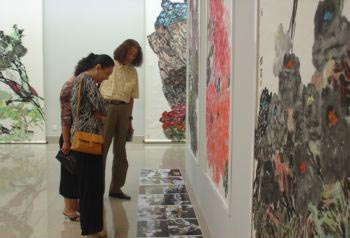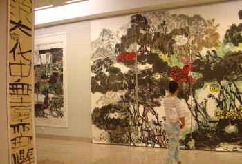 开幕式后,来宾进入五层展厅观看展览。进入展厅,人们首先被作品独特的装裱形式所吸引。据展览总策划人郑晓华教授介绍,为配合“中国风”的主题,在装裱作品时大胆采用了黑红两种基色,参照西方现代艺术中大色块组的方法,给传统中国书画艺术的装裱形式一个全新的感官形式。