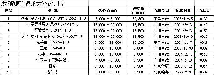 彦涵是我国著名版画家,其版画作品在拍卖市场上的成交情况相对较好。据不完全统计,在2003年以前,彦涵版画作品仅成交一件,而2003至今已有17件版画作品成交,成交率超过50%。这在成交率普遍不高的版画市场里算是不俗的表现,成交价格相对较高。尤其是2003年中国嘉德推出其版画《钢铁是怎样炼成的》(封面)以30,800成交,成为其版画作品成交价格的最高纪录。随着版画收藏理念的逐渐成熟,彦涵的版画作品将会有很大的升值空间。彦涵创作于1957年的版画《老羊倌》在1999年北京瀚海仅以5,500元成交,而此件作品在2004年中国嘉德秋拍中以13,200元成交,增值2倍多。对于投资和收藏者来说,现在收藏彦涵的版画应该是一个很好的时机。