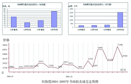 2005年何海霞作品的市场表现十分正面,尤其是北京荣宝秋拍推出来自何海霞直系亲属与何海霞艺术研究会收藏的何海霞精品之后,迅速集聚了市场买气,拍卖成交价格也为理想。除此之外,北京九歌春拍的《小三峡图》以148.5万元成交,该价格一度成为了何海霞作品的最高价。但在短短的几个月后,则被北京保利秋拍的《峡江胜景图》418万元成交价再度刷新。2005年何海霞作品的拍卖成交比率创出记录,上拍数量120件,成交108件,成交率达到了90%,可见市场对何海霞作品的追捧程度。而从其作品目前每平方尺均价4.18万元来说,正是积极介入的大好时机。