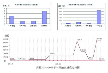 龚贤是“金陵八家”之一,在2005年的艺术品市场上表现突出,价格涨幅较大。2005年龚贤作品的成交量为6件,成交总额达到了2237.1万元;而2004年成交作品4件,成交额仅为331.71万元,可见作品价格的涨幅之大。从个人作品的成交指数走势图来看,2004年之前的价格曲线一直较为平稳,2005年则呈现急速攀升的图形走势在单件作品。目前其单位平方尺的价格已经达到了97.2万元,占据了高端的市场价位。从单件作品的拍卖成交价而言,如北京华辰秋拍的《山水立轴》成交价为1320万元,刷新了龚贤个人作品的新纪录,上海朵云轩的龚贤《仙山楼阁立轴》(1683年作)成交价为440万元,中贸圣佳的《寒山图立轴》以352万元成交。2005年龚贤作品价格持续攀升的态势,已经引起市场人士的广泛关注,相信未来的升值潜力仍可期待。
