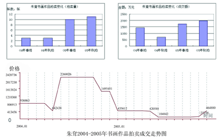 八大山人即清代巨匠朱耷,“清初四僧”之一。2005年是八大山人作品价格持续攀升的一年,作品的成交量和成交额上都比2004年有所增长,但单件作品的涨幅则相对平稳。具体而言,朱耷作品在2005年拍卖成交作品21件,成交率为75%,总成交额为3808.9万元。单件作品的价格也大多处在高位,如中贸圣佳秋拍的朱耷《花鸟四屏》成交价为1320万元,香港佳士得的石涛、八大山人《山水花鸟册页》(七开)成交价为665.68万元,中贸圣佳秋拍的八大山人《鸲鹆立轴》以275万元成交。由此可见,八大山人市场的买气仍在,而后市一旦有精品出现,仍将出现理想的拍卖成交价格。同时买家在2005年的表现也呈现出新的趋势,即购买作品不再因现场的非理性因素而被其左右,而是以作品的真实品质与艺术价值为最终的考量,逐渐从“非理性”向“理性”逐渐过渡。