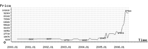 为什么说周春芽的作品是今年当代油画市场价格上升最快的呢?以下数据可能会给您答案。据统计,周春芽历年成交作品价格前30名中只有5名是在2005年创出的,剩下的全是在今年被更改。从历史上看,周春芽的油画2000年到2003年上拍作品5件,成交4件,成交率80%。但是价格还处于很低的水平,最高的成交价格只有4.4万元。2004年上拍数量9件,成交8件,依然成交率相当的高,这说明周春芽的作品已经受到市场的欢迎。2005年中国油画整体价格上涨的趋势显现,当代艺术板块更是风起云涌,各路高手作品的成交纪录几乎在每场拍卖后都会刷新,周春芽的作品上拍27件作品,全部成交。最高成交价的作品是上海国拍的《石头系列》以82.5万元成交。2005年刘晓东、岳敏君等艺术家作品的价格已经突破了百万元大关,而周春芽的作品还没有那么强势的市场表现。2006年周春芽作品的行情“暴发”,成交纪录不断刷新,四月香港苏富比举行的当代艺术拍卖会上周春芽的《太湖系列》以214.5万元成交。6月诚轩推出的《青石图》以220万元成交,紧接着江苏嘉恒推出的《生活像花儿一样美丽》以253万元成交,6月上海泓盛的《山石图》以440万元成交。周春芽作品的价格在2006年价格有了质的提升。