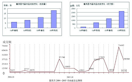 董其昌作为晚明“松江派”的领军人物,其作品在2004年的成交量仅为14件,在成交价上也未有高价创出。从2005年春季开始,董其昌的书画作品在拍卖市场上一扫往年的低迷,精品迭出,在董其昌个人作品成交纪录的前10位中有8位在2005年被刷新。仅是2005年上半年董其昌的作品就上拍16件,下半年更是有27件流入市场,其中共成交作品29件,成交率为67%。2005年春季,从北京翰海推出的董其昌《山水卷》创出了995.5万元的高价起,整个董其昌作品的价格水平有了急剧的抬升,至秋季更是呈现出了活跃的市场发展态势,投资收益率十分理想,如广东保利推出的董其昌《青绿山水手卷》成交价为1375万元,创出了董其昌个人作品成交价的新纪录;中国嘉德秋拍的《风亭秋影图》(1620年作)成交价格为671万元;香港佳士得的《临淳化阁帖册页》(1624-1625年作)成交价为345.136万元。由此可见,董其昌作品的市场在2005年开始真正活跃,不仅有了明显的涨幅,更体现出一代宗师的市场行情。