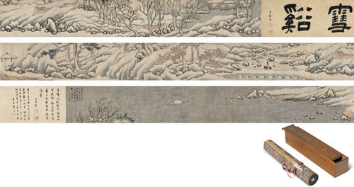 “明四家”指明代中期吴门画派的画家沈周、文征明、唐寅和仇英。 “明四家”的书画作品一向有一定的市场流通量,2005年流入拍卖市场的作品约有百余件,成交率和成交价亦十分可观,精品的迭出带动了板块整体的高价特征。从2004年之前的拍卖市场来看,唐寅和文征明精品在市场出现较多,而沈周和仇英因缺乏精品的出现而在价格涨幅上难有突破,但这种情况在2005年的市场上因沈周书画精品的迭现而得到了迅速改变,价格涨幅惊人,如沈周的《寒江独钓手卷》在浙江皓翰秋季拍卖中以1320万元高价成交,另一件作品1478年作《古木花冠镜心》在中贸圣佳的成交价为660万元。此外,唐寅的《梧竹十亩》立轴在嘉信昌的成交价为825万元,高出2004年的最高价即上海崇源《携琴访友图》451万元的近2倍;文征明嘉靖壬子年(1552年)作《溪山积雪图并草书咏雪诗合卷》手卷在上海崇源也以737万元的高价成交。“明四家”板块在2005年的中国艺术市场上已形成高价板块,市场随着精品的不断涌现而反映出热烈的购买欲望,其市场的后期发展值得期待。
