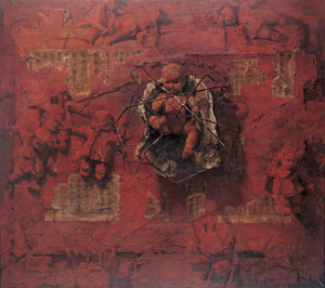 郭润文的《天惶惶·地惶惶》(120×135 cm)多次出版,以中国民间咒语“天惶惶·地惶惶”为题材,表达了父母对子女的关爱,以及对生命的不测的焦虑心情,同时也反映出父母的慈爱之心。画面中坠落的儿童玩具以及民间药方的残件把荒诞的画面空间转化为现实境界的一种表述。