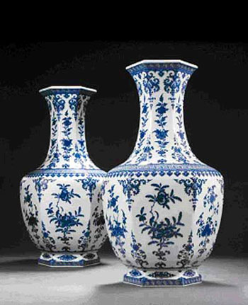 7月12日,伦敦苏富比拍卖会中,拍卖了中国乾隆年间官窑瓷器精品——一对青花折枝花果纹六方大瓶,以70万英镑的价格成交。